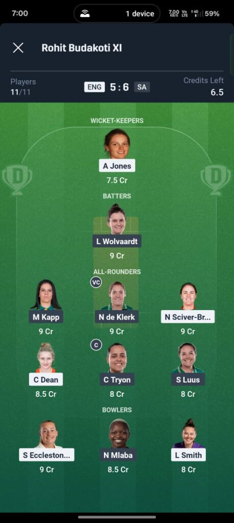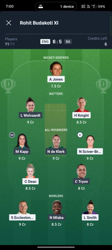 - Captain (Kapp) & VC (Wolvaardt): This is the “South Africa Fights Back” ticket. If SA is to win, these two must have career-defining days. A Kapp 5-wicket haul or a Wolvaardt century would win you the league.